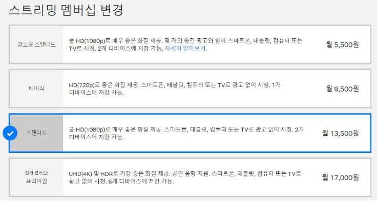 | 콘텐츠 저장 | 한 번에 한대의 디바이스에만 저장 가능 | 스탠다드/프리미엄 맴버십 : 한 번에 2대 이상의 디바이스에 콘텐츠 저장 가능 |